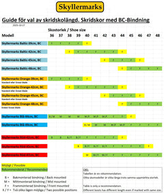 Modellen finns i fyra längder som täcker de flesta skostorlekar utan att bindningen behöver justeras, se tabell bland bilderna: