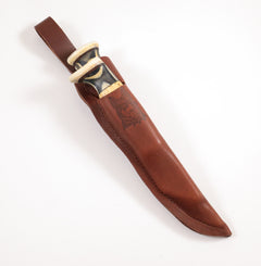 Brukskniv med björnmotiv på läderfodral/skaft i renhorn masurbjörk.