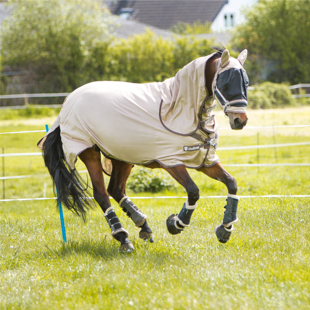 Summer Guard-halstäcket från Stallone kan fästas på Stallone Summer Guard-eksemtäcket med två starka kardborreband. Dessutom kan den matchande Flybuster-flughuvan fästas på halsstycket med kardborreband, vilket ger ett perfekt allroundskydd mot insekter.