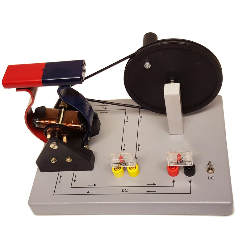 Modellen fungerar både som generator och som motor för likström. Det magnetiska fältet alstras av en magnet förstärkt av två järnskänklar. En lysdiod lyser då generatorn ger ström.