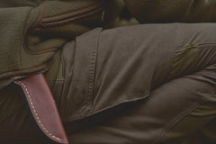 För praktisk användning är Hill-byxorna utrustade med lättåtkomliga sidfickor samt rymliga benfickor med skyddslock och tysta magnetlås, vilket möjliggör snabb åtkomst till utrustning utan störande ljud. I den högra benfickan finns en integrerad patronhållare. Justerbara benslut gör det enkelt att anpassa passformen efter kängor och terräng.