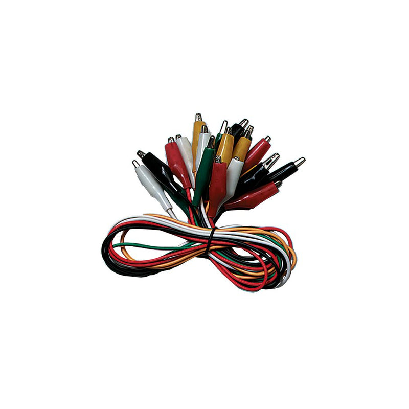 10 sladdar i fem färger med isolerade krokodilklämmor. Längd 45 cm.