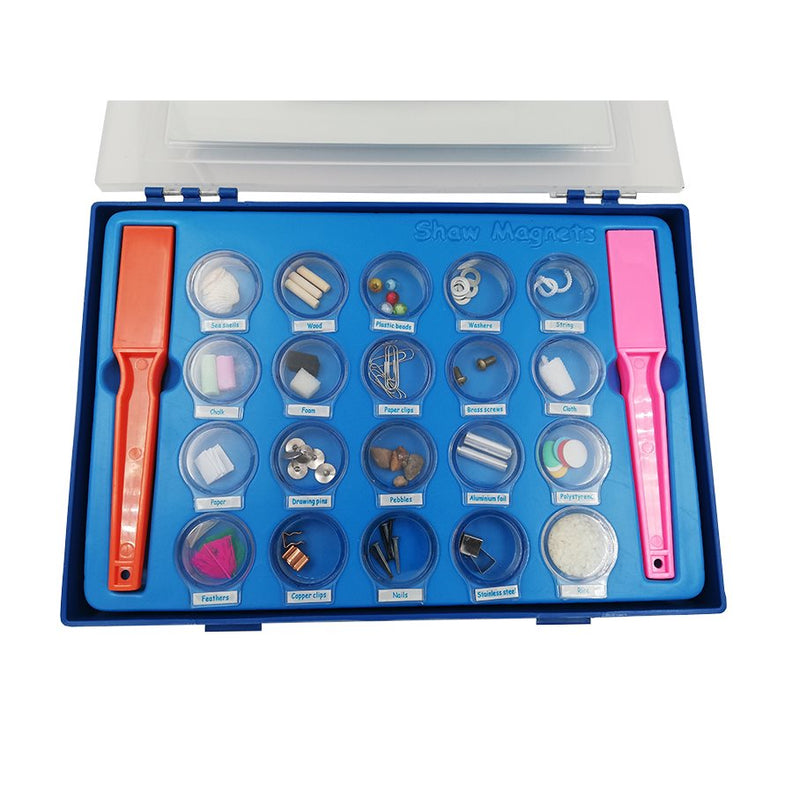 Vilka ämnen fastnar på en magnet? Praktisk låda med tjugo olika vardagsmaterial och två magneter. De olika ämnena är inneslutna i små plastaskar som gör testningen enkel och förhindrar dem att komma bort. En del av dem är magnetiska och en del är det inte. Några av dem påverkas även av statisk elektricitet.