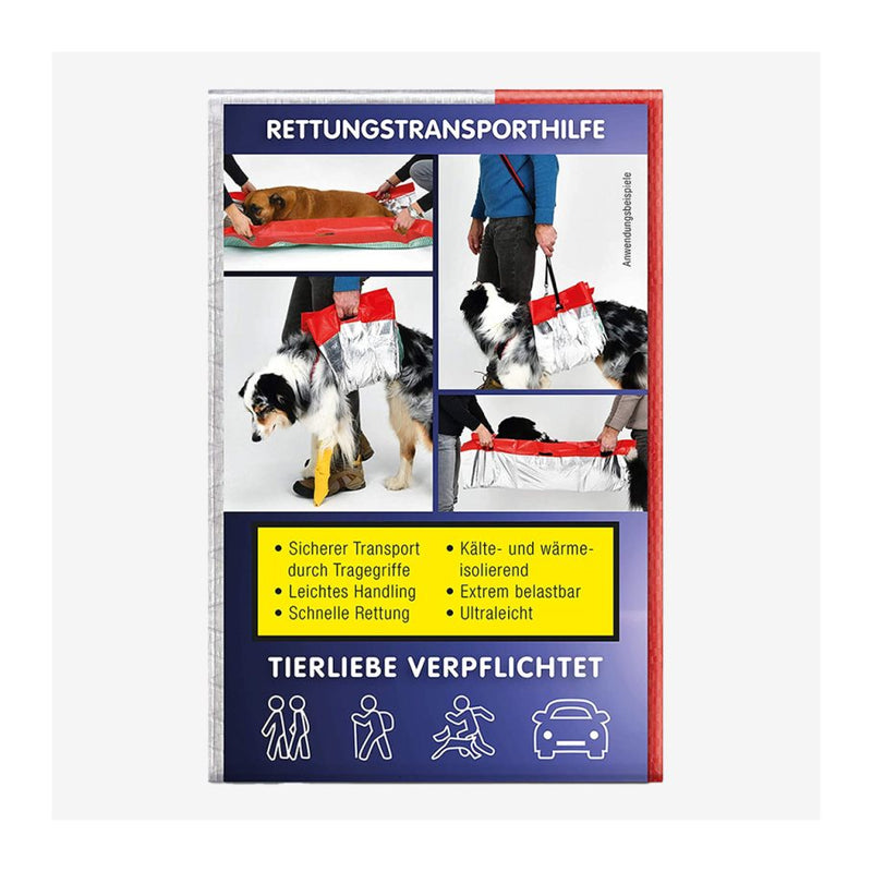 Räddningsfilt för hund/djur, reflekterar och bevarar kroppsvärme,tre handtag på varje sida som gör filten till en "bår"så att man kan flytta en skadad hund vid behov.