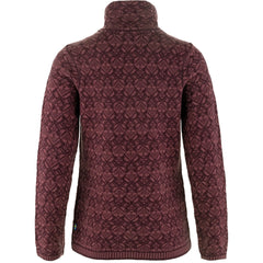 Den har en tvåvägsdragkedja framtill och en hög, rak krage som skyddar mot kyla runt halsen. Ullens naturliga egenskaper gör koftan både isolerande och fukttransporterande, vilket ger behaglig värme även när den är fuktig. Den lilla läderloggan på ärmen ger en diskret och genuin detalj som för tankarna till Fjällrävens hantverkstradition.
