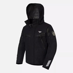 Jackan är tillverkad av ett slitstarkt fyrlagersmaterial med ett HARD-TEX®-membran , vilket garanterar vattentäthet och andningsförmåga. Den ergonomiska ärmsnittet förbättrar rörligheten, medan den avtagbara huvan kan justeras i två dimensioner för perfekt passform. Jackan har en central YKK tvåvägs vattentät dragkedja, förstärkt med både en utvändig flik och en invändig underflik för extra skydd.