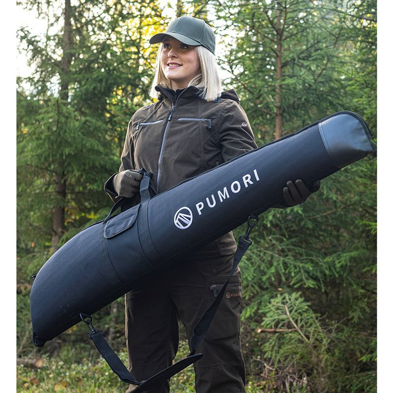 Detta De Luxe vapenfodral är ca 135cm långt och ca 27cm högt så även dom höga kikarmontagen ska få plats i vapenfodralet. Mindre ficka på båda sidor för tillbehör. Justerbar axelrem att bära vapenfodralet med, förstärkt i fram vid pipmynning.