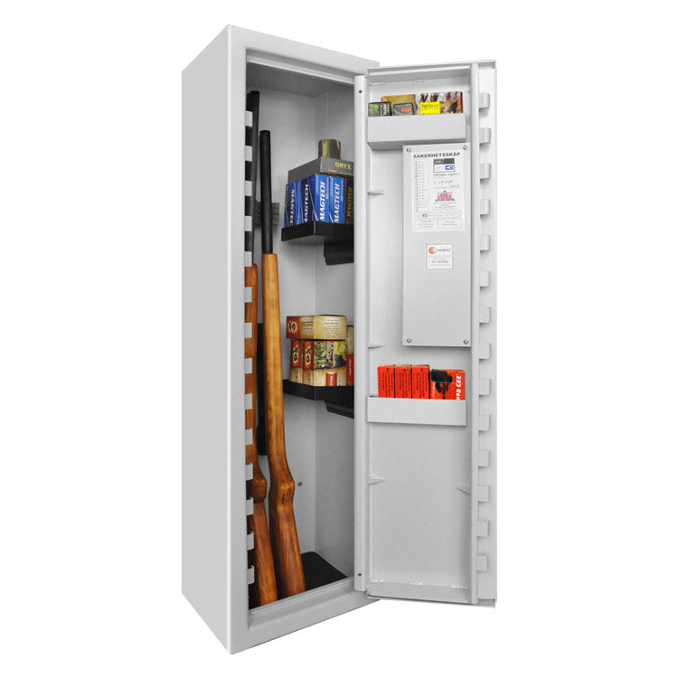 Beskrivning av SP55 vapenskåp: Ett säkerhetsskåp med plats för upp till 5 stycken gevär. Enligt vapenlagen ska säkerhetsskåp som understiger 150 kg förankras, skåpet är lätt att förankra tack vare fyra förankringshål i botten och i ryggen. Vapenskåpet är testat och certifierat enligt SSF3492 och godkänt för 20 poäng, vilket innebär att du i praktiken får förvara 20 stycken gevär alternativt 10 stycken pistoler eller 5 stycken helautomatiska vapen inuti skåpet.