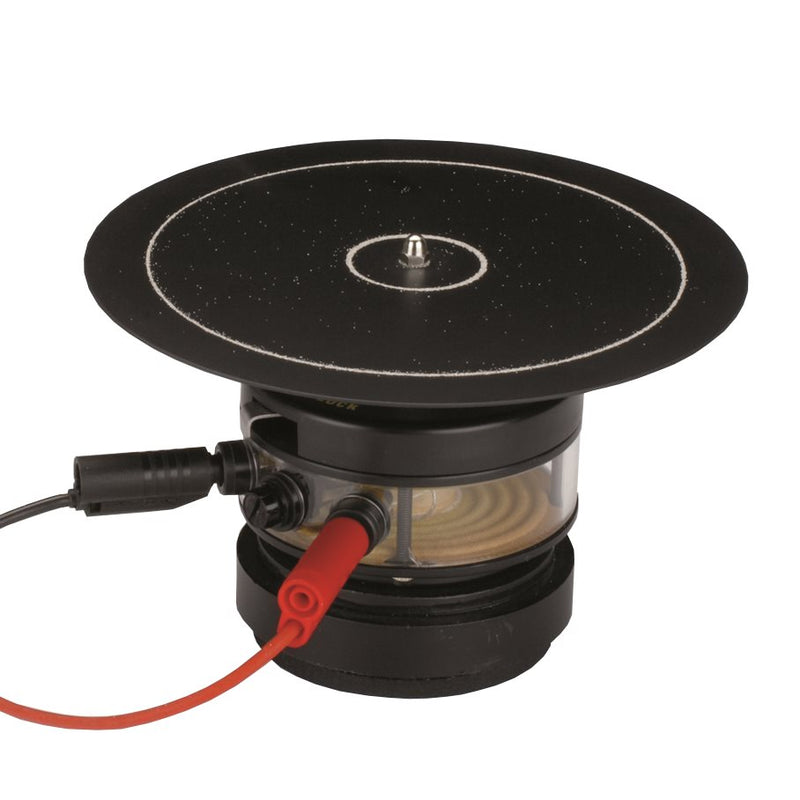 Rund platta till vibratorn. Strö fin sand eller salt på plattan och vackra resonansmönster, sk Chladnifigurer, erhålls.